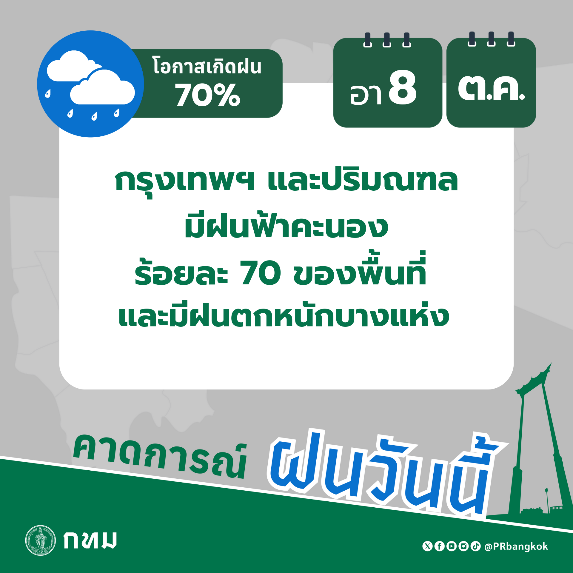 กรุงเทพฯ-วันนี้คาดการณ์ฝน 70% รายงานสถานการณ์ประจำวันที่ 8 ตุลาคม 2566กรุงเทพมหานครและปริมณฑล มีฝนฟ้าคะนอง ร้อยละ 7...