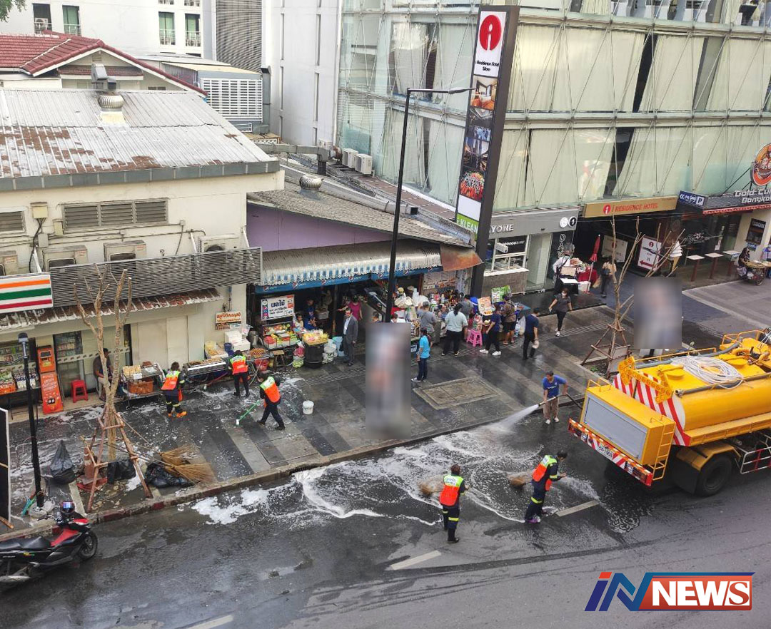 'เขตบางรัก'ล้างทำความสะอาดทางเท้า พร้อมจุดพักขยะย่านสาทรช่องนนทรีย์