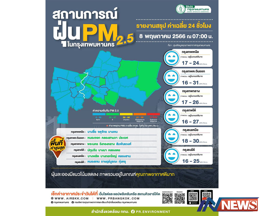 กรุงเทพฯ-ศูนย์ข้อมูลคุณภาพอากาศกรุงเทพมหานครขอสรุปผลการตรวจวัด PM2.5 วันที่ 8 พฤษภาคม 2566 เวลา 05.00-07.00 น. (3 ...