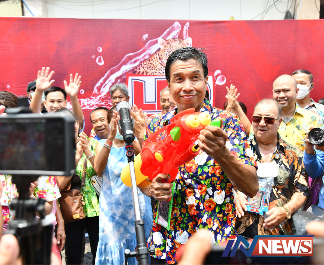 พ่อเมืองกทม.ใส่เสื้อดอกออกมาเปียกกัน ดวลปืนฉีดน้ำชุ่มฉ่ำที่ถนนข้าวสาร