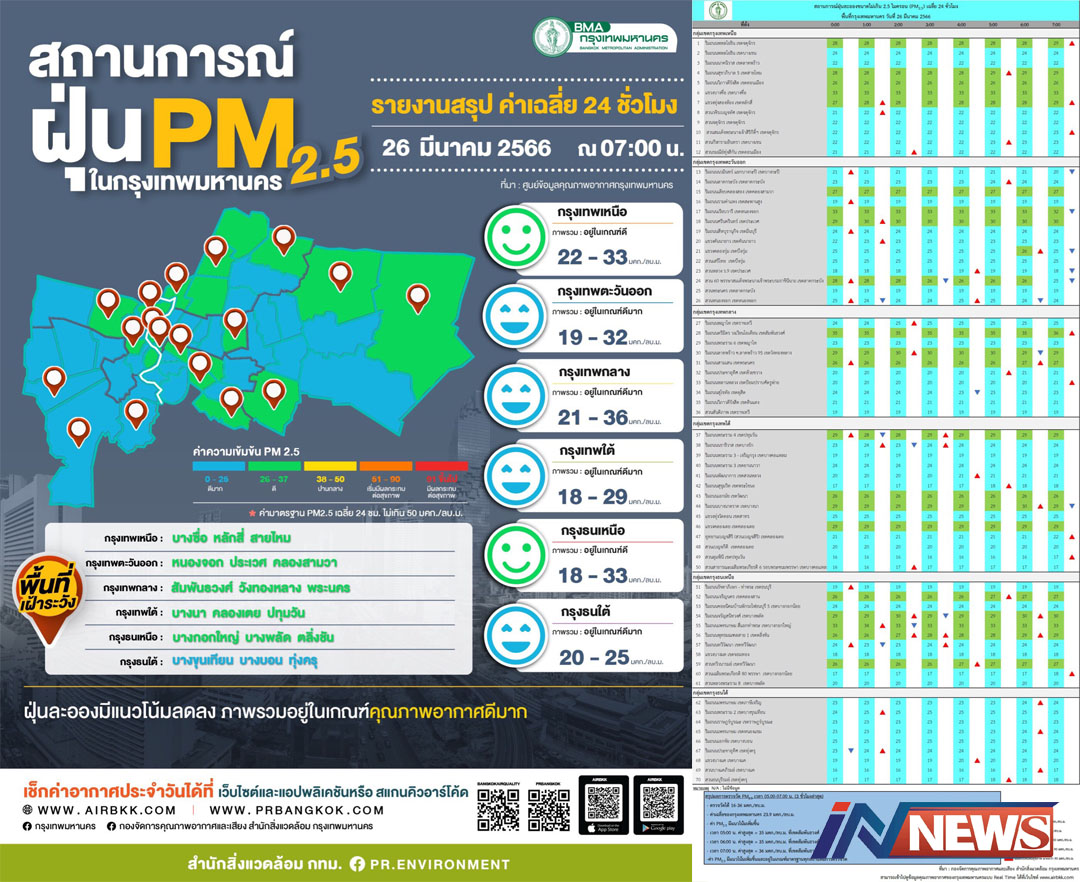 กรุงเทพฯ-ศูนย์ข้อมูลคุณภาพอากาศกรุงเทพมหานครสรุปผลการตรวจวัด PM2.5 วันที่ 26 มี.ค.2566 เวลา 05.00-07.00 น. (3 ชั่วโมงล่า...