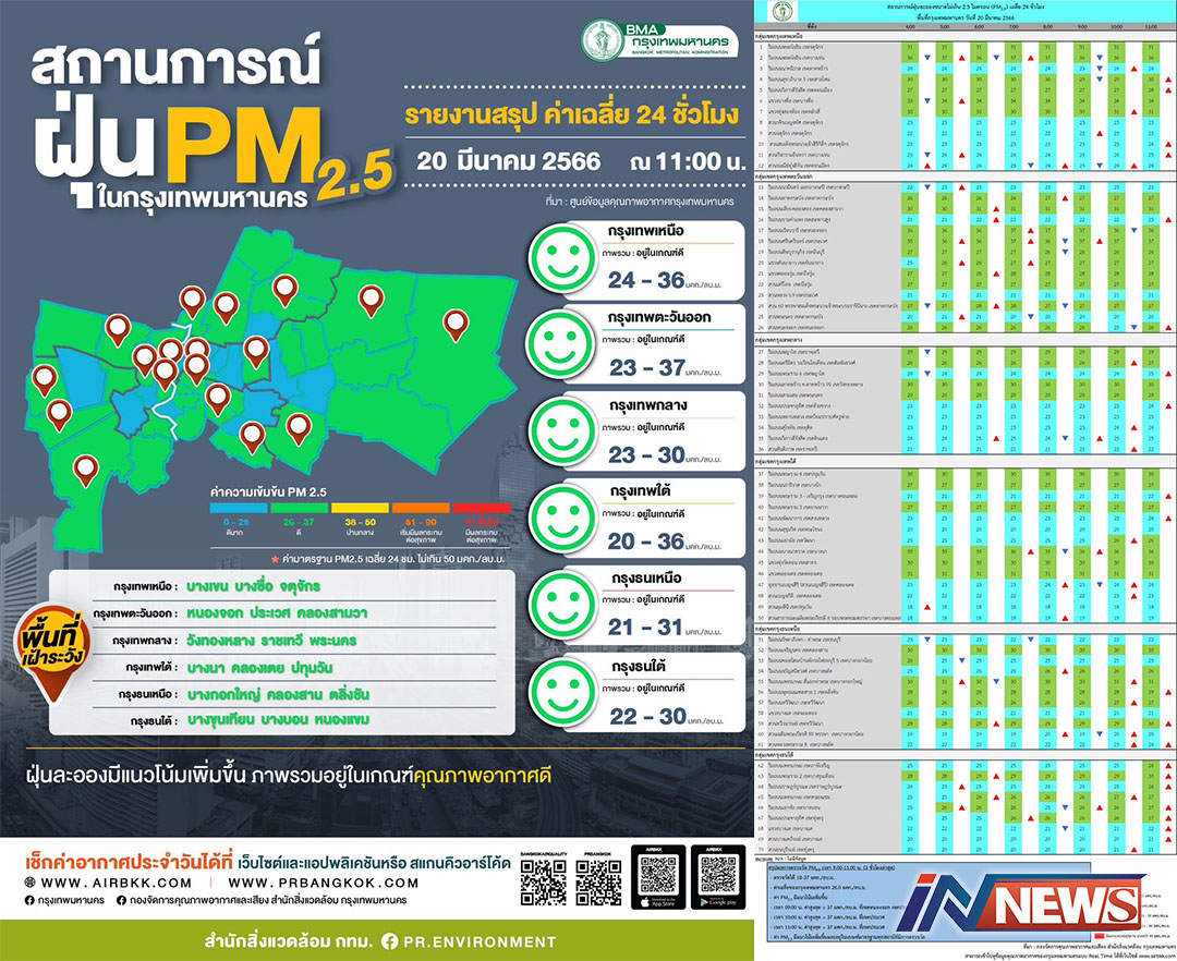 กรุงเทพฯ-ศูนย์ข้อมูลคุณภาพอากาศกรุงเทพมหานครสรุปผลการตรวจวัด PM2.5 วันที่ 20 มี.ค. 2566 เวลา 9.00-11.00 น. (3 ชั่วโมงล่า...