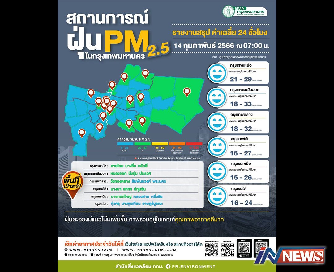 กรุงเทพฯ-ศูนย์ข้อมูลคุณภาพอากาศกรุงเทพมหานคร สรุปผลการตรวจวัด PM2.5 วันที่ 14 กุมภาพันธ์ 2566 เวลา 05.00-07.00 น. (3 ชั่...