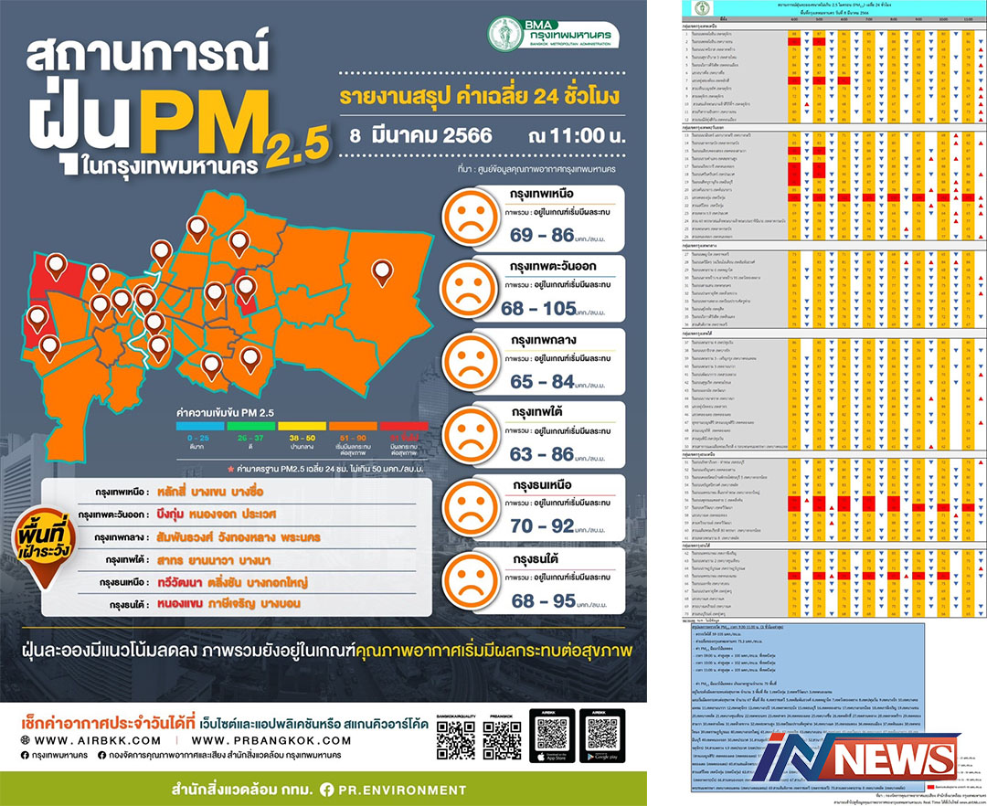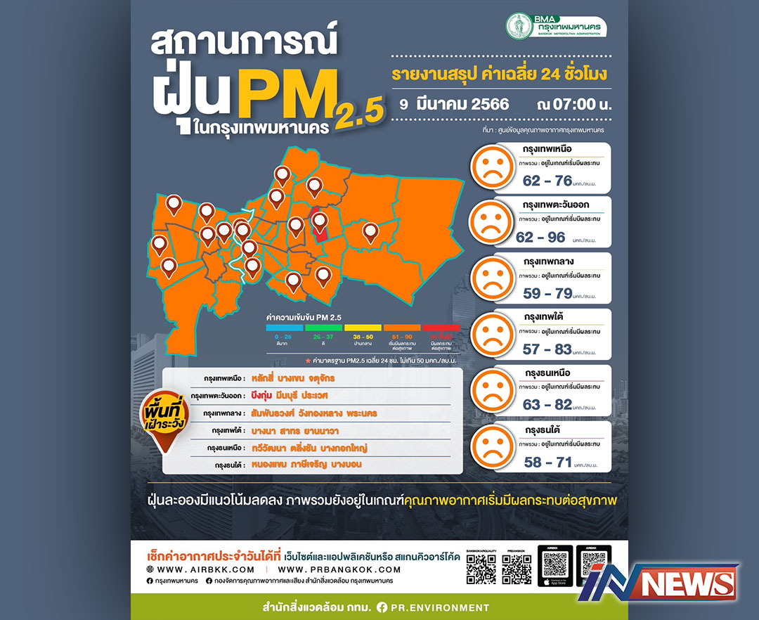 กรุงเทพฯ-ศูนย์ข้อมูลคุณภาพอากาศกรุงเทพมหานคร สรุปผลการตรวจวัด PM2.5 วันที่ 9 มี.ค. 2566 เวลา 05.00-07.00 น. (3 ชั่วโมงล่...