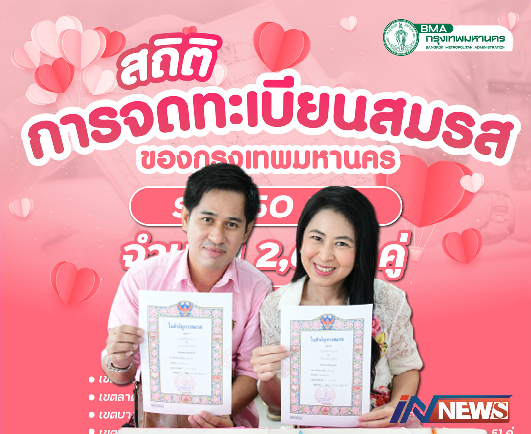 ยอดจดทะเบียนสมรสในกทม.2.6พันคู่รัก เขตบางรักนำโด่ง/เขตห้วยขวางรั้งท้าย