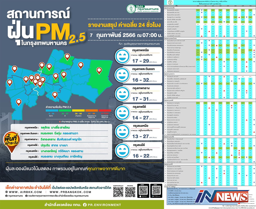 กรุงเทพฯ-ศูนย์ข้อมูลคุณภาพอากาศกรุงเทพมหานครขอสรุปผลการตรวจวัด PM2.5 วันที่ 7 กุมภาพันธ์ 2566 เวลา 05.00-07.00 น. (3 ชั่...