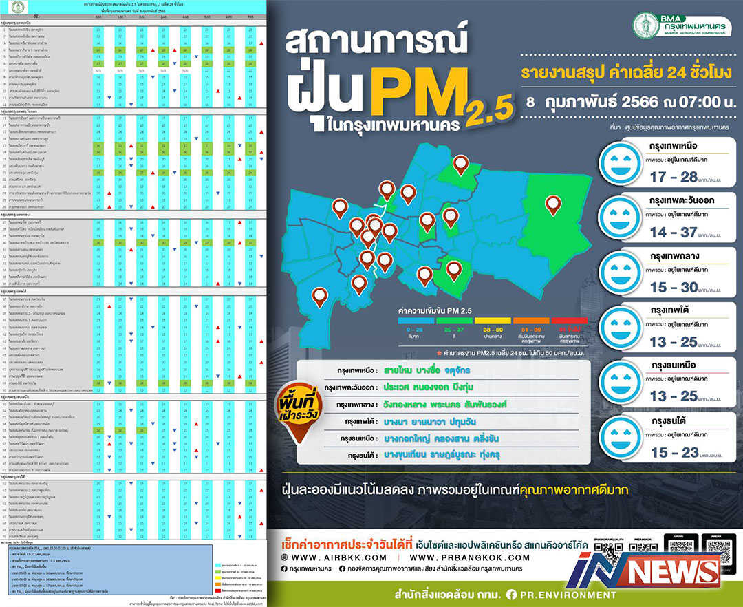 กรุงเทพฯ-ศูนย์ข้อมูลคุณภาพอากาศกรุงเทพมหานครขอสรุปผลการตรวจวัด PM2.5 วันที่ 8 กุมภาพันธ์ 2566 เวลา 05.00-07.00 น. (...