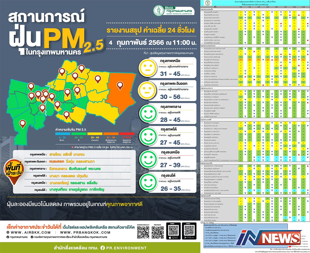 กรุงเทพฯ-ศูนย์ข้อมูลคุณภาพอากาศกรุงเทพมหานครขอสรุปผลการตรวจวัด PM2.5 วันที่ 4 กุมภาพันธ์ 2566 (3 ชั่วโมงล่าสุด)ตรวจวัดได...