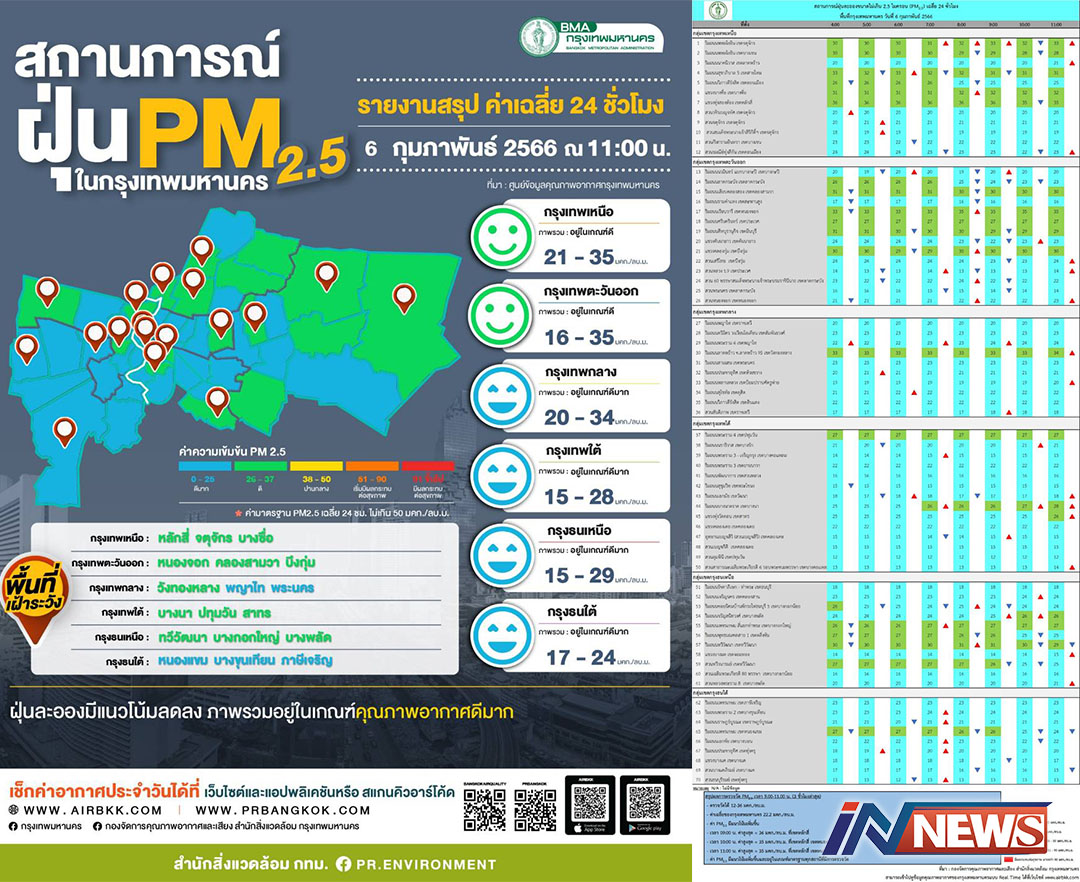 กรุงเทพฯ-เช้านี้!! ค่าฝุ่นอยู่ในเกณฑ์มาตรฐาน ศูนย์ข้อมูลคุณภาพอากาศกรุงเทพมหานคร สรุปผลการตรวจวัด PM2.5 วันที่ 6 กุมภาพั...