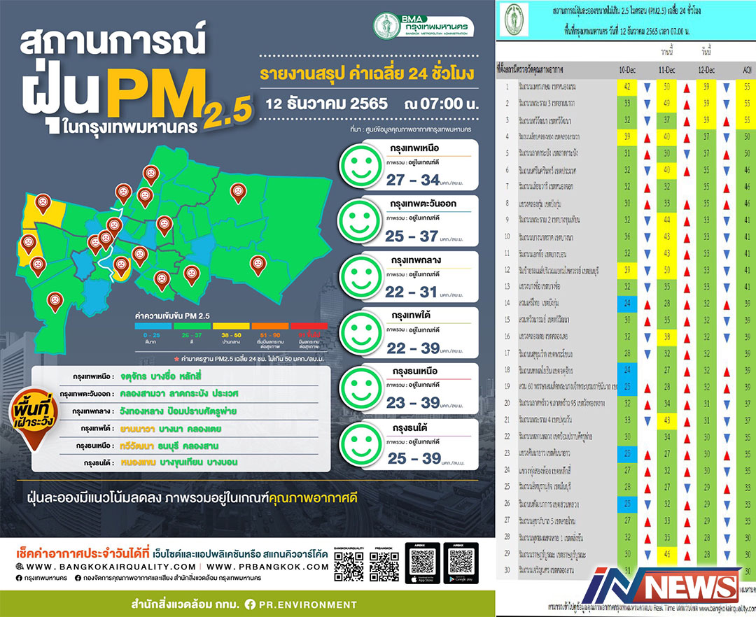 กรุงเทพฯ-ศูนย์ข้อมูลคุณภาพอากาศกรุงเทพมหานครสรุปผลการตรวจวัด PM2.5 ประจำวันที่ 12 ธ.ค. 65 ณ เวลา 07.00 น. ค่าฝุ่นละออง P...