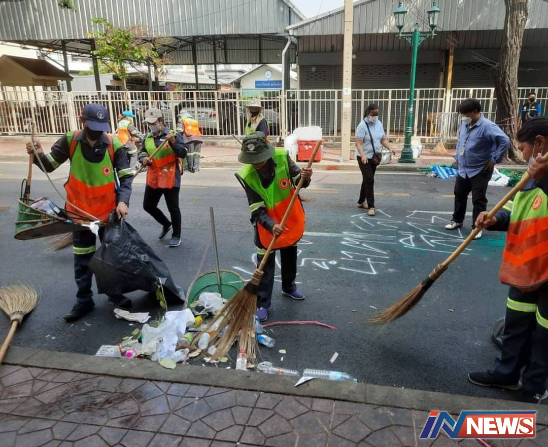 กรุงเทพฯ- เขตพระนครแจงทำความสะอาดถนนดินสอตามหน้าที่ก่อนเปิดการจราจร ภายหลังกลุ่มผู้ชุมนุมแยกย้าย พบว่ามีข...