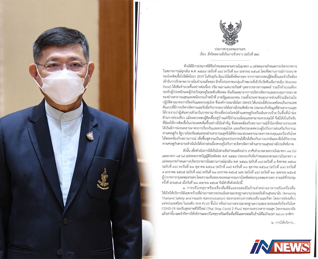 กรุงเทพฯ ประกาศกรุงเทพมหานคร เรื่อง สั่งปิดสถานที่เป็นการชั่วคราว ฉบับที่ 52 การบริโภคสุราหรือเครื่องดื่มที่มีแอลกอ...