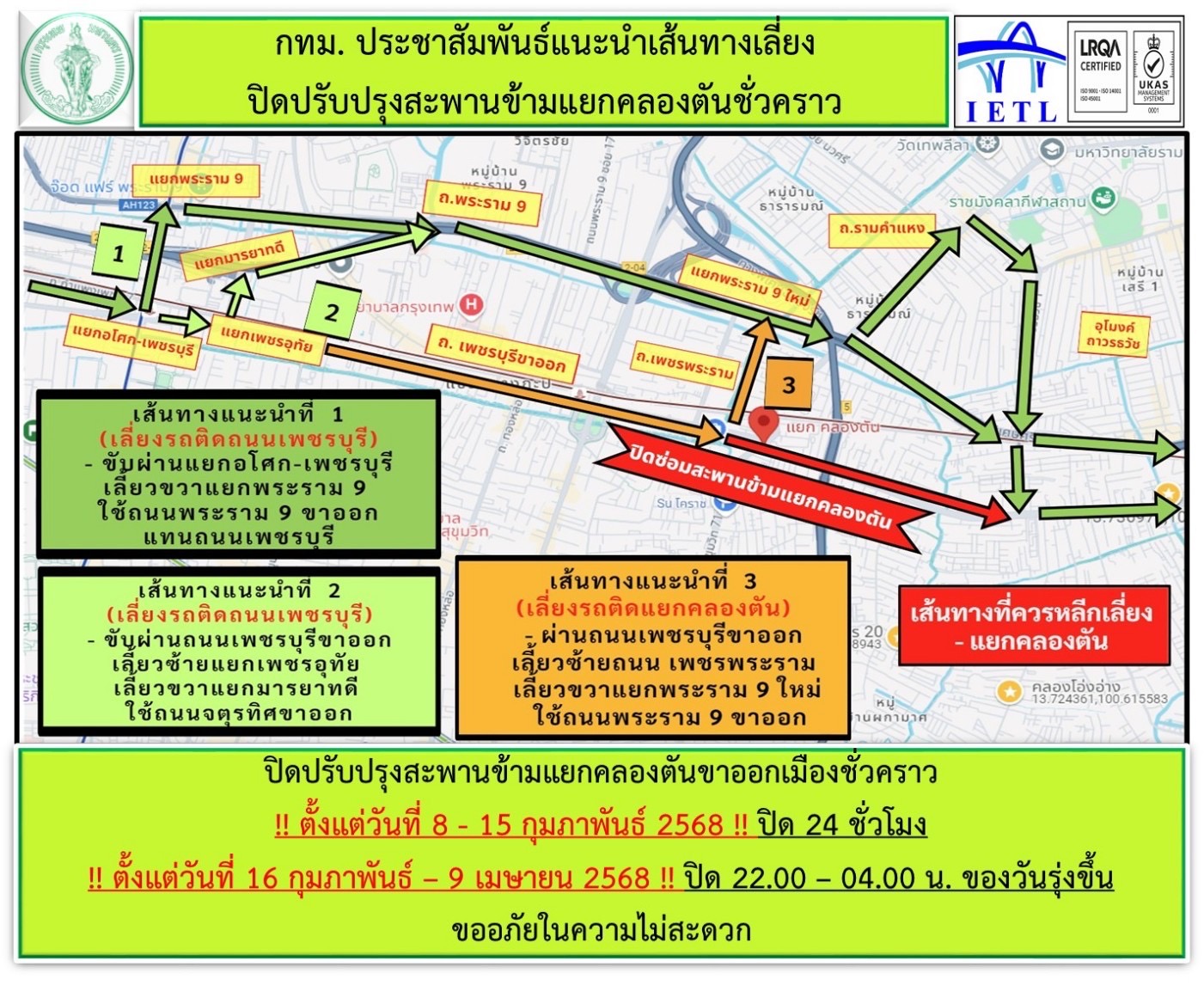 ปิดซ่อมสะพานข้ามแยกคลองตัน24ชั่วโมง ตั้งแต่วันนี้ถึง15ก.พ.68