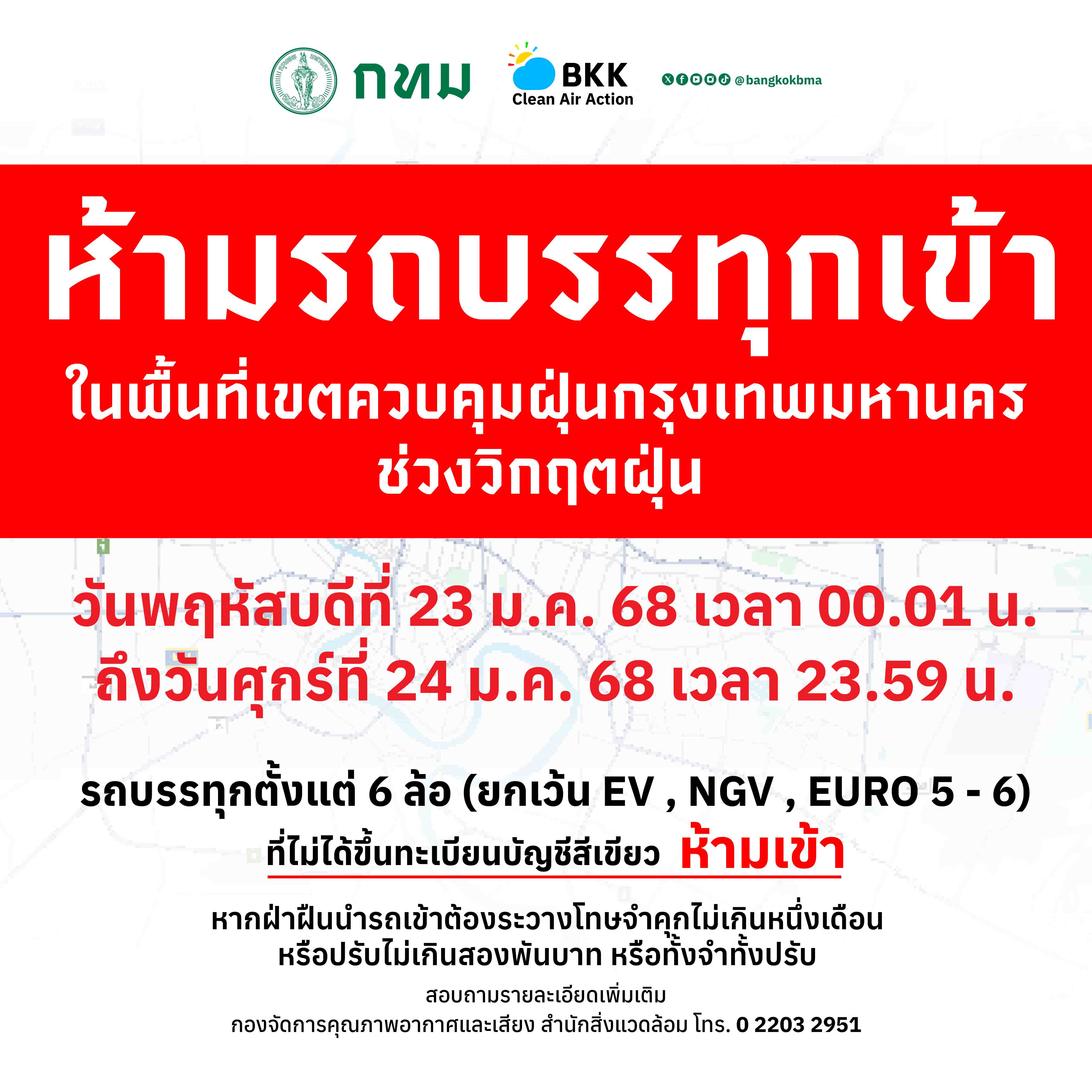 กรุงเทพฯ-กทม. ยกระดับสู้ฝุ่น PM2.5 ด้วยประกาศมาตรการ LEZ ห้ามรถบรรทุกนอกบัญชี Green List เข้าพื้นที่ 13 เขต ในวงแหวนรัชด...