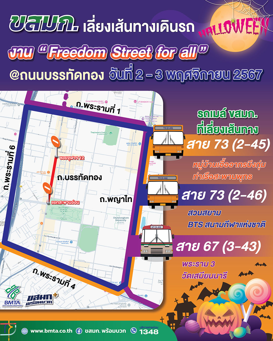 กรุงเทพฯ-ขสมก. ปรับเส้นทางเดินรถ เลี่ยงจุดจัดกิจกรรม Freedom Street for all บนถนนบรรทัดทอง วันที่ 2 - 3 พ.ย. 67