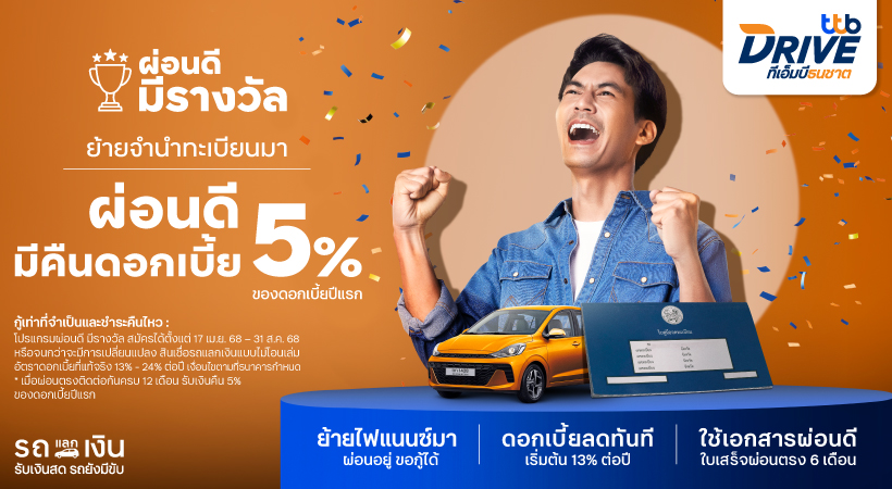 คนผ่อนรถเฮ!รีไฟแนนซ์จำนำทะเบียนรถ มาทีทีบีผ่อนดีมีรางวัลรับเงินคืนดอก5%