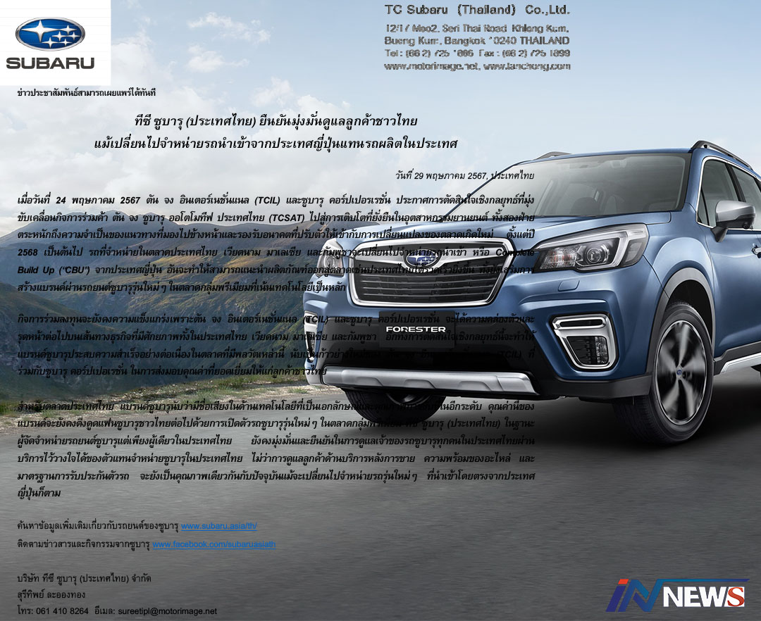 กรุงเทพฯ-ทีซี ซูบารุ (ประเทศไทย) ยืนยันมุ่งมั่นดูแลลูกค้าชาวไทยแม้เปลี่ยนไปจำหน่ายรถนำเข้าจากประเทศญี่ปุ่นแทนรถผลิตในประ...