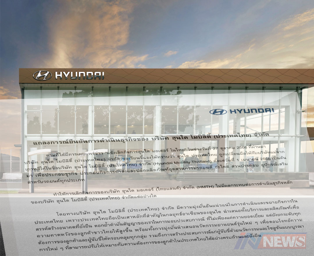 ฮุนได โมบิลิตี้'แถลงการณ์ยืนยันไม่กระทบ 'ฮุนได มอเตอร์(ไทยแลนด์)'เลิกกิจการ