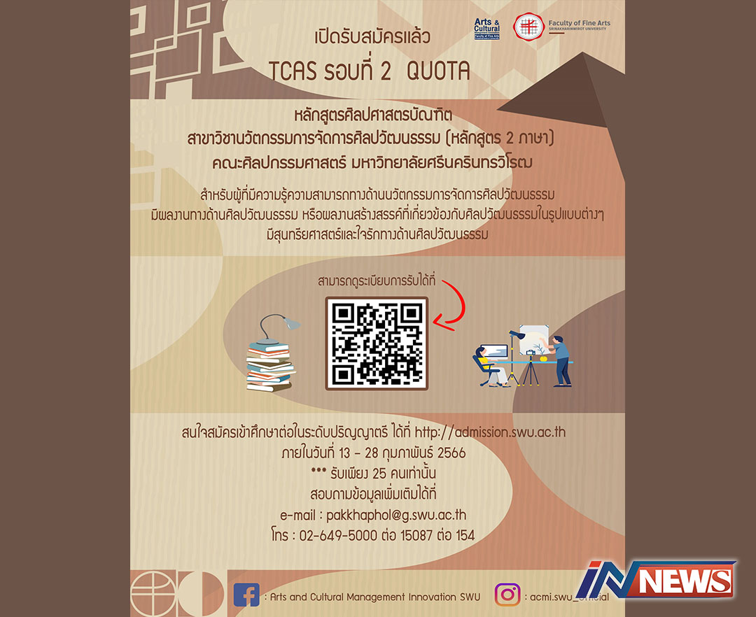 สาขานวัตกรรมฯ'ศิลปกรรมศาสตร์มศว.' เปิดรับสมัครTCASรอบที่2Quota