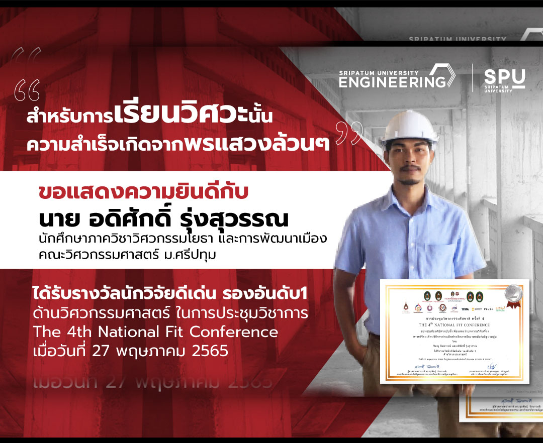 กรุงเทพฯ-มหาวิทยาลัยศรีปทุม ขอแสดงความยินดีกับ นายอดิศักดิ์ รุ่งสุวรรณ นักศึกษาภาควิชาวิศวกรรมโยธาและการพัฒนาเมือง คณะวิ...