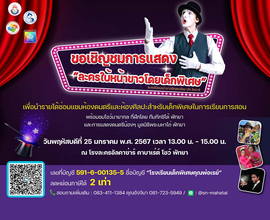 ชลบุรี-ศูนย์พัฒนาการเด็กพิเศษ และโรงเรียนเด็กพิเศษคุณพ่อเรย์ขอเชิญทุกท่านร่วมสัมผัสความสุขในโลกเงียบกับ“ละครใบ้หน้...