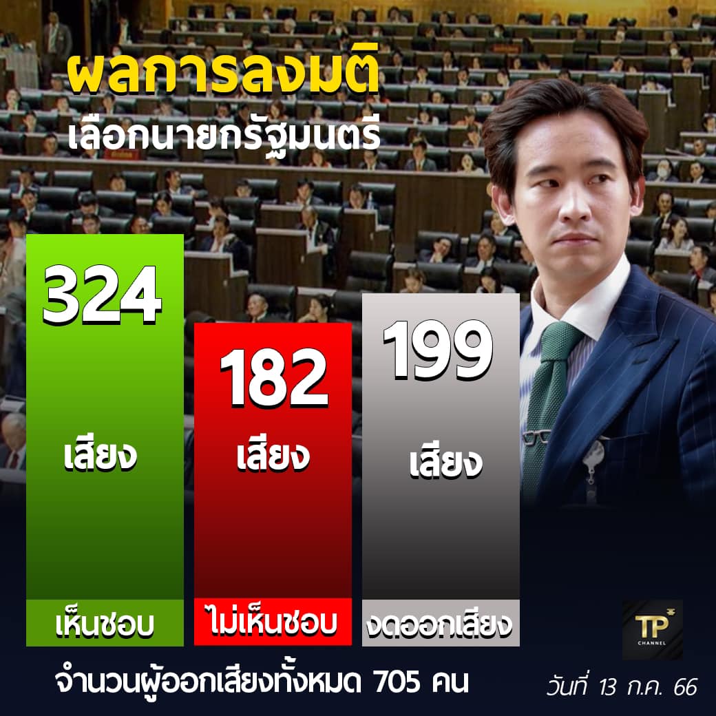 กรุงเทพฯ-การโหวต "พิธา ลิ้มเจริญรัตน์" เป็นนายกฯ ครั้งแรก ปรากฎว่า พิธา ได้รับการโหวตเห็นชอบ 324 คน ไม่เห็นชอบ...