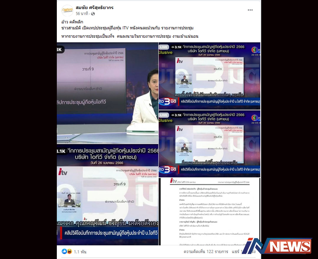 กรุงเทพฯ-หลังจากที่รายการข่าว3มิติ ทางช่อง 3 ได้ออกมาเปิดคลิปการประชุมผู้ถือ หุ้นไอทีวี ที่จัดประชุมขึ้นเ...