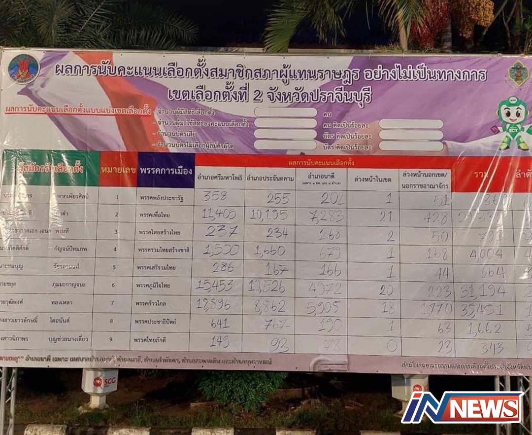 ปราจีนบุรี-(คืบหน้า)ผลนับคะแนนอย่างไม่เป็นทางการ ใน 3 เขตเลือกตั้งแบบบัญชีรายชื่อ พลิกไป-มาตลอดล่าสุดก้าวไกลมา 2 เขตล้มแ...