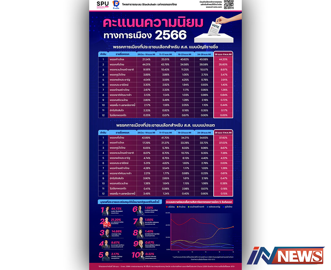 กรุงเทพฯ-(6 พ.ค. 2566) - มหาวิทยาลัยศรีปทุม (SPU) ร่วมกับดีโหวต (D-vote) เปิดเผยผลสำรวจ ‘คะแนนความนิยมทา...