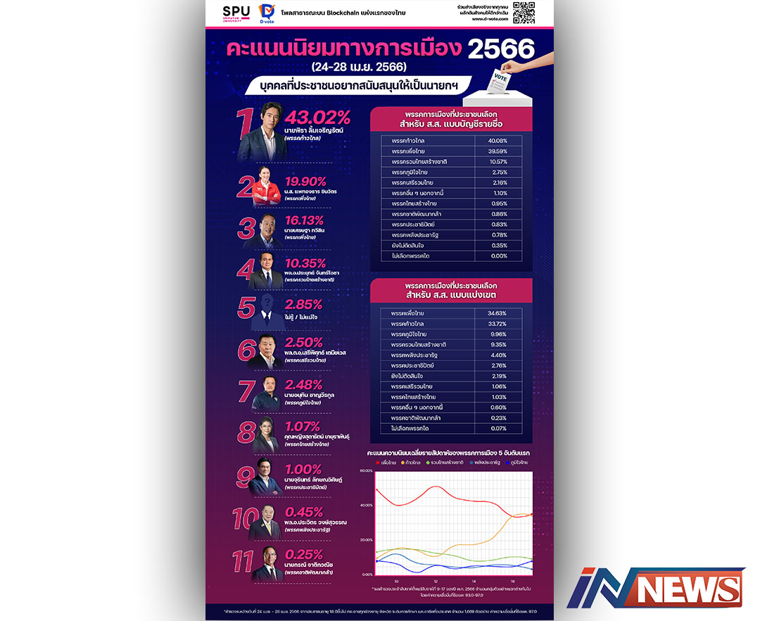 ม.ศรีปทุม-ดีโหวตเปิดเผยบล็อกเชนโพล ‘เลือกตั้ง66’ภท.พุ่งสูสีรทสช./พท.-กก.นำ
