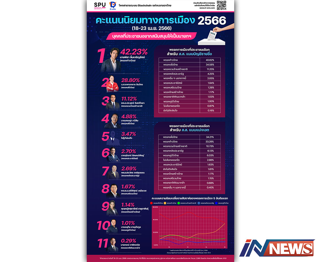 กรุงเทพฯ-(25 เม.ย. 2566) - มหาวิทยาลัยศรีปทุม (SPU) ร่วมกับดีโหวต (D-vote) เปิดเผยผลสำรวจ ...
