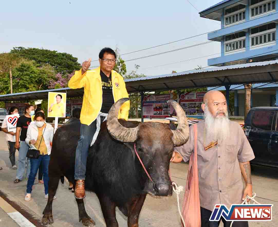 สิงห์บุรี-บรรยากาศการรับสมัครเลือกตั้ง ส.ส. วันแรกคึกคัก มีผู้สมัครขี่ควายเข้ามาในเขต