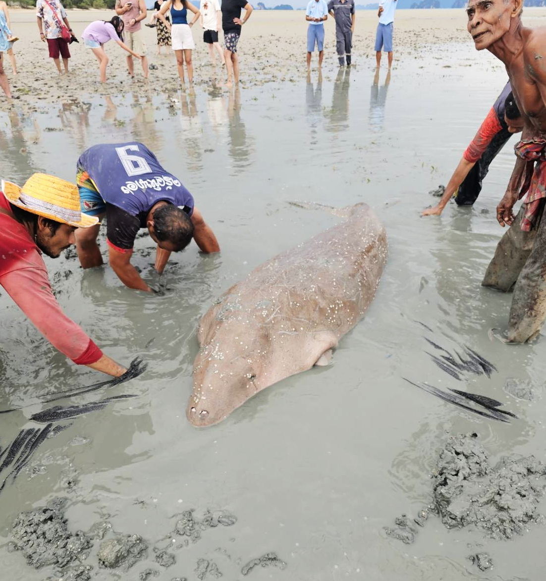 ชาวเกาะยาวใหญ่รวมพลังช่วยพะยูนยักษ์ เกยตื้นติดน้ำแห้งช่วยส่งกลับสู่ทะเล