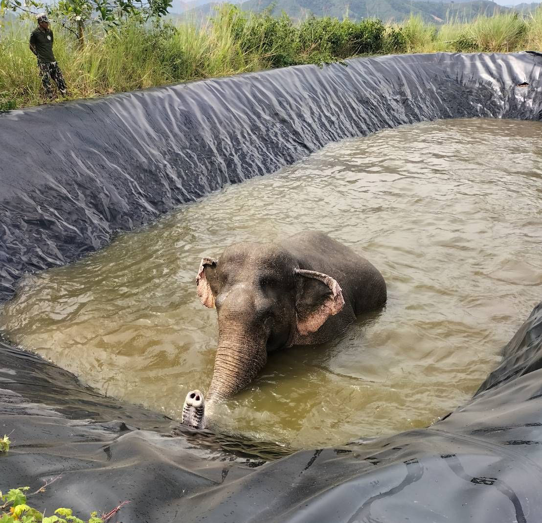 เร่งช่วยเจ้าด้วนหูด่างช้างเพศผู้ตกสระน้ำ หลังปลอดภัยยืนนิ่งหันหน้าขอบคุณ