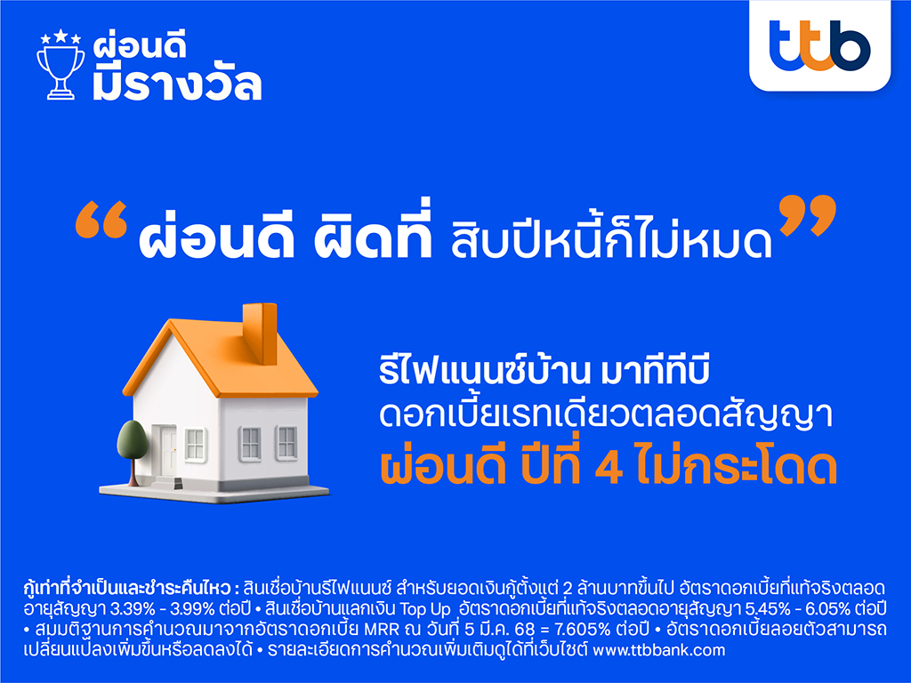 ทีทีบีชวนคนผ่อนบ้านดีรีไฟแนนซ์ให้จบ ไม่ต้องรีไฟแนนซ์ทุก3ปีอีกต่อไป!