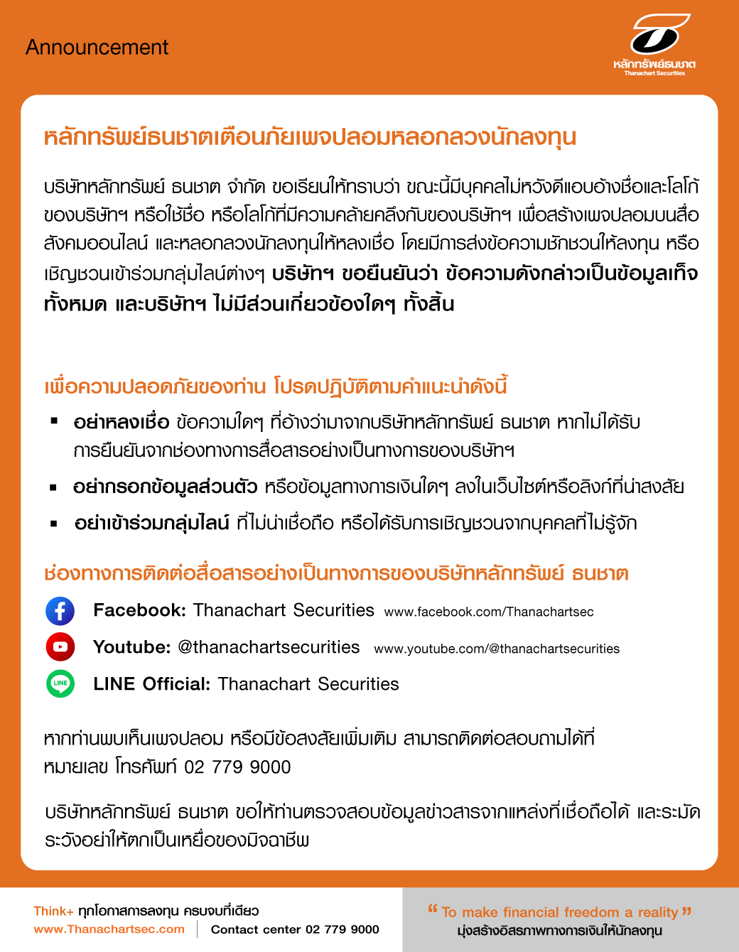 หลักทรัพย์ธนชาตลงเตือนภัย'เพจปลอม' หลอกลวงนักลงทุน