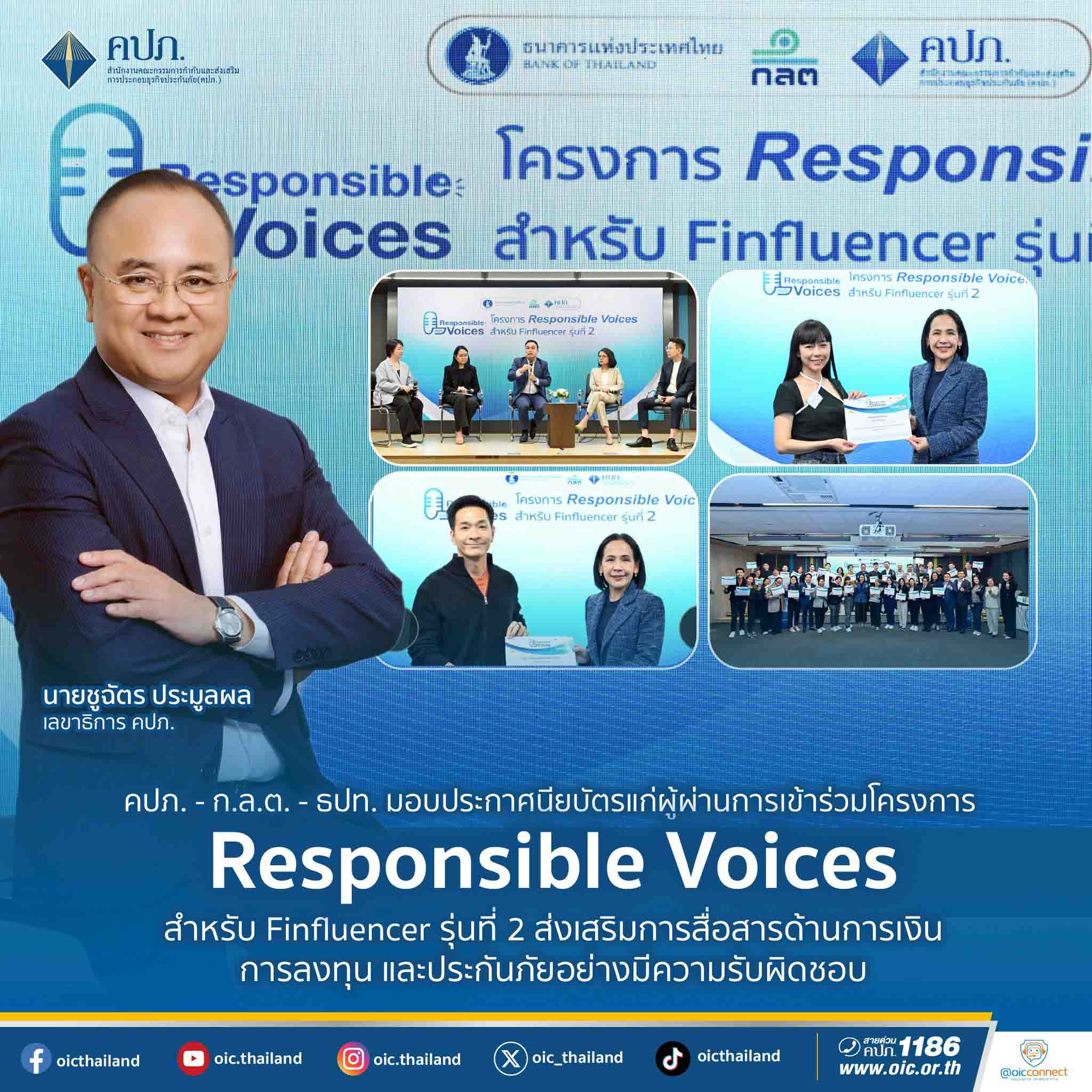 กรุงเทพฯ-คปภ.-ก.ล.ต. - ธปท. มอบประกาศนียบัตรแก่ผู้ผ่านการเข้าร่วมโครงการ Responsible Voices สำหรับ Finfluencer รุ่นที่ 2...