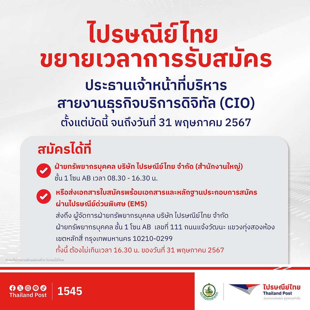 ไปรษณีย์ไทยขยายรับสมัครถึง31พ.ค.นี้ 'ปธ.เจ้าหน้าที่บริหารธุรกิจบริการดิจิทัล'