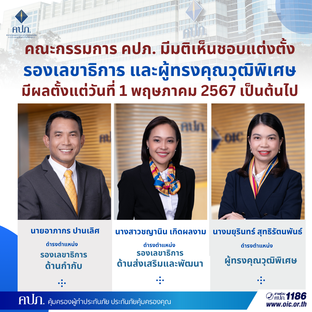 คณะกรรมการคปภ.แต่งตั้งรองเลขาธิการ และผู้ทรงคุณวุฒิพิเศษให้มีผล1พ.ค.นี้