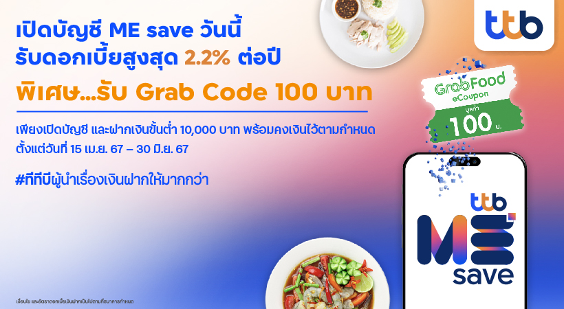 ทีทีบีชวนออมง่ายได้กับบัญชีME save รับดอกเบี้ยสูงสุด2.2%ตั้งแต่บาทแรก