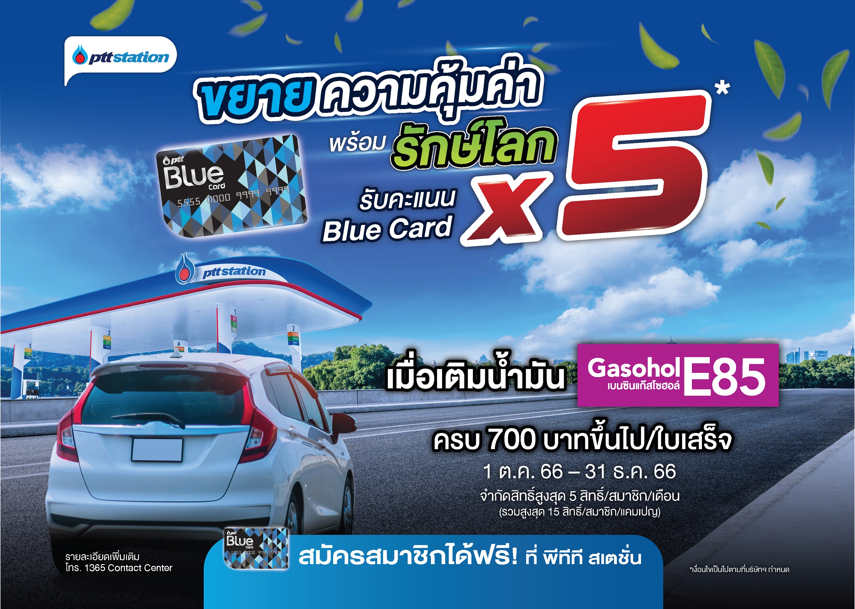 พีทีที สเตชั่น ขยายความคุ้มค่า พร้อมรักษ์โลก x 5 สมาชิก Blue Card เติมน้ำมันแก๊สโซฮอล์ E85 ครบ 700