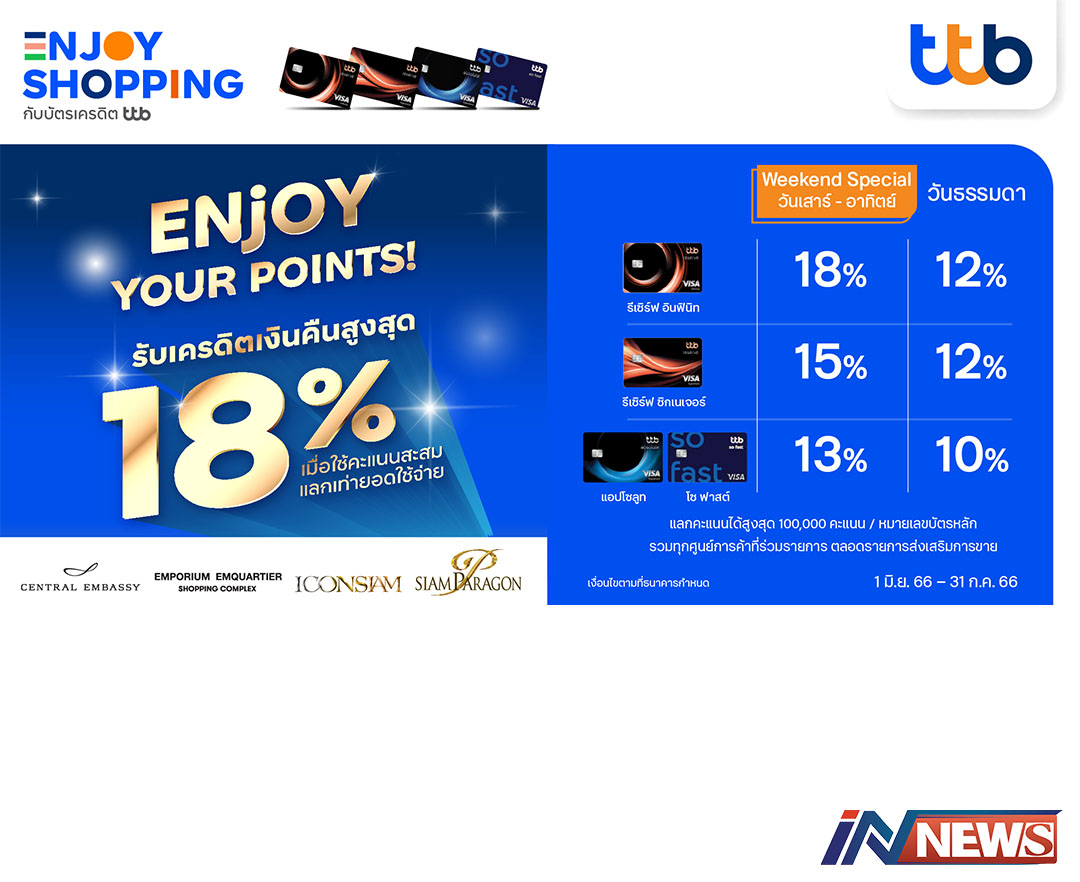 บัตรเครดิตttbจับมือ5ศูนย์การค้าดังมอบ เครดิตเงินคืน18%เมื่อใช้คะแนนสะสม