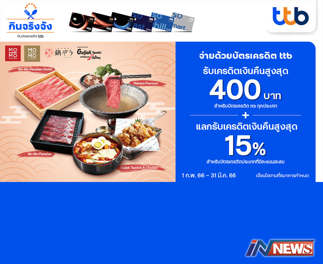 กินจริงจังกับบัตรเครดิตttbรับเงินคืนสูงสุด 400บ.พร้อมแลกรับเงินคืนสูงสุด15%