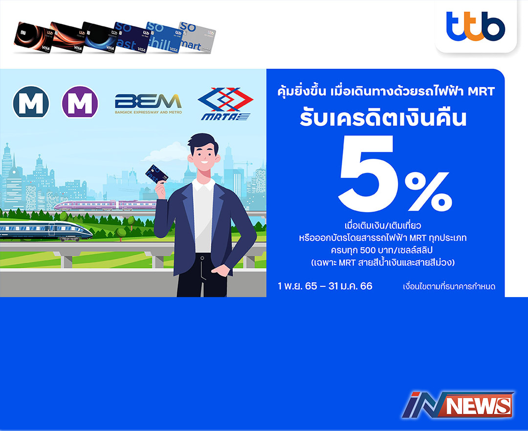 บัตรเครดิตทีทีบีให้ชีวิตดี๊ดี!!มอบเครดิต เงินคืน5%ที่รถไฟฟ้าMRT