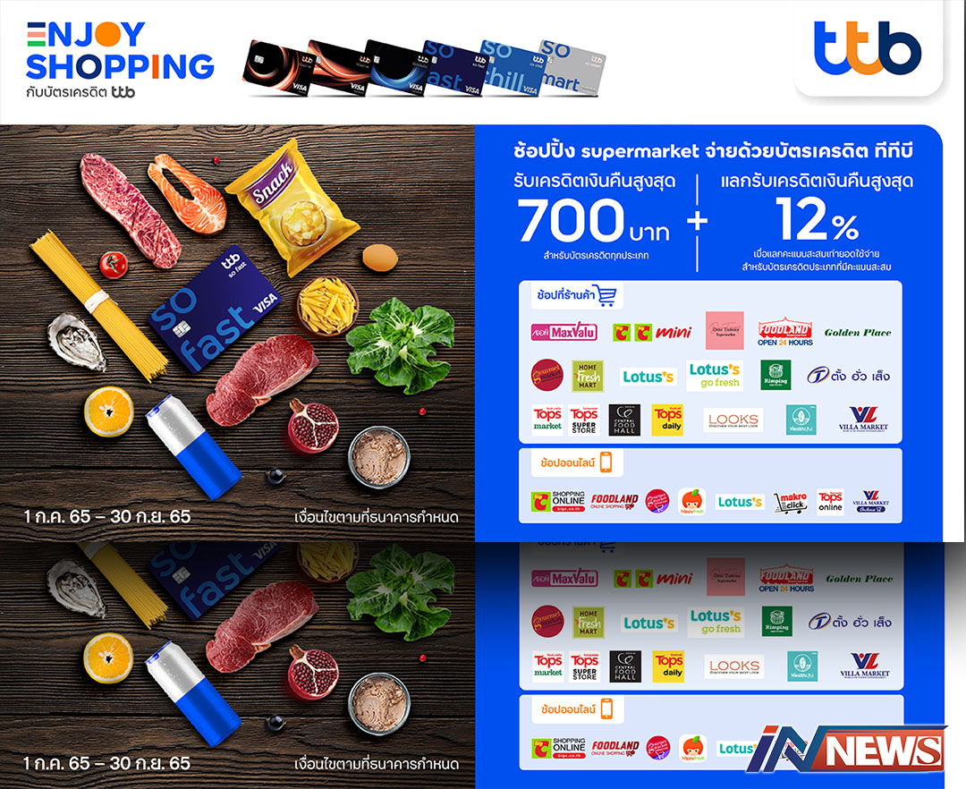 บัตรทีทีบีรับเครดิตเงินคืนสูงสุด700บาท แลกรับสูงสุด12%เช้อปซูเปอร์มาร์เก็ต