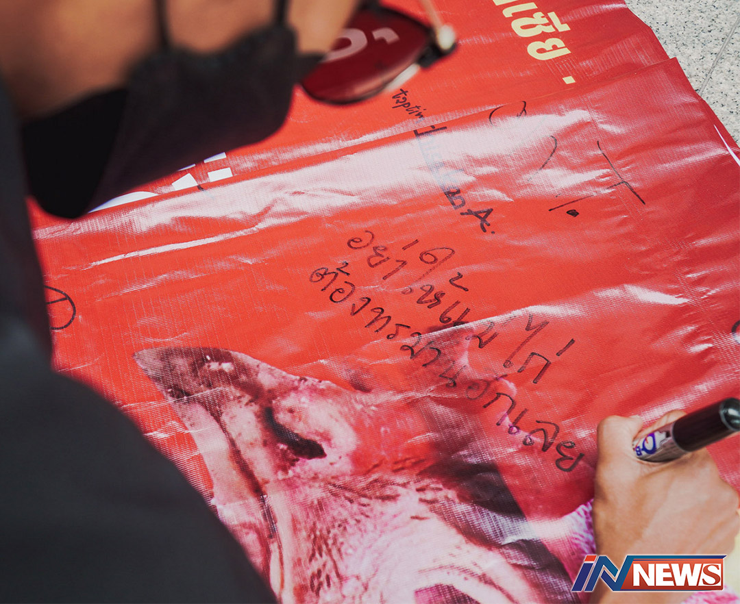 กรุงเทพฯ-23 พฤษภาคม 2565 : ซิเนอร์เจีย แอนิมอลองค์กรพิทักษ์สัตว์สากลชูป้ายรณรงค์ที่มีผู้สนับสนุนลงชื่อเรียกร้องนโยบายไข่...