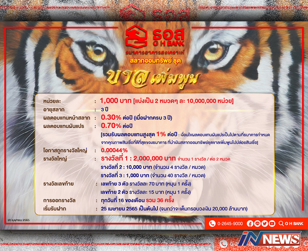 กรุงเทพฯ-ธอส.เปิดขายสลากออมทรัพย์ ชุด “ขาลเพิ่มพูน” ตั้งแต่วันจันทร์ที่ 25 เม.ย.2565 เวลา 9.49 น. ล่าสุด ในว...