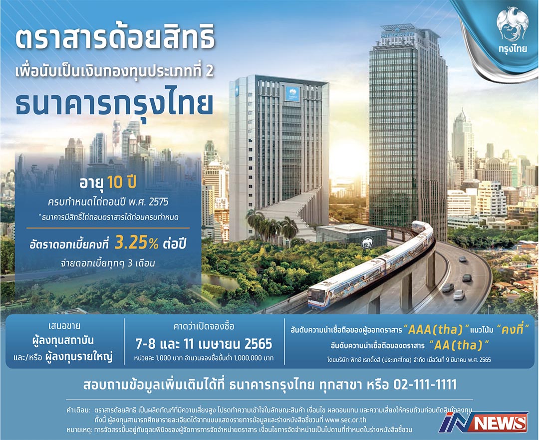 กรุงเทพฯ-ธนาคารกรุงไทยเตรียมขายตราสารด้อยสิทธิเพื่อนับเป็นเงินกองทุนประเภทที่ 2 อายุ 10 ปี อัตราดอกเบี้ย 3.25% ต่อปี จ่า...