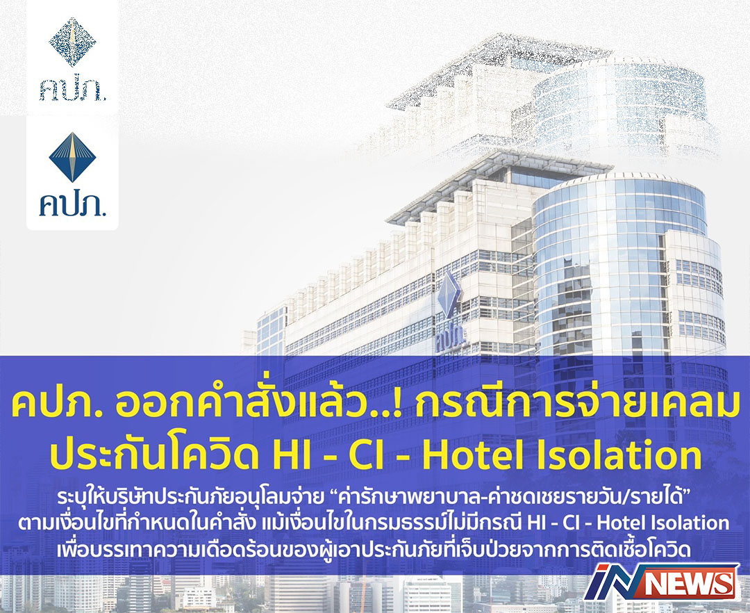 กรุงเทพฯ-คปภ. ออกคำสั่งแล้ว..! กรณีการจ่ายเคลมประกันโควิด HI - CI - Hotel Isolation ระบุให้บริษัทประกันภัยอนุโลมจ่า...