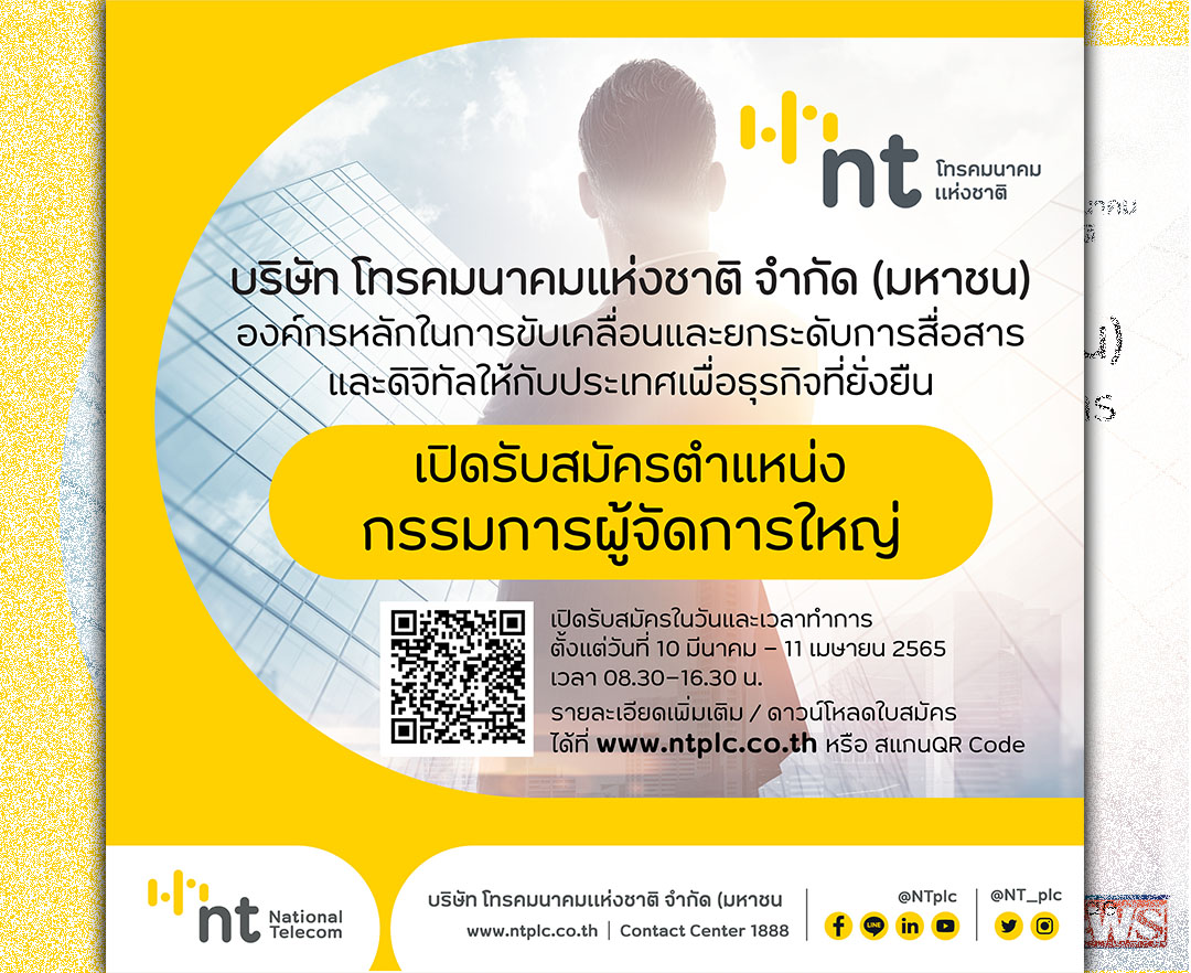 กรุงเทพฯ-NT เปิดรับสมัครตำแหน่งกรรมการผู้จัดการใหญ่ ผ่านทางออนไลน์บน www.ntplc.co.th โดยสามารถยื่นเอ...